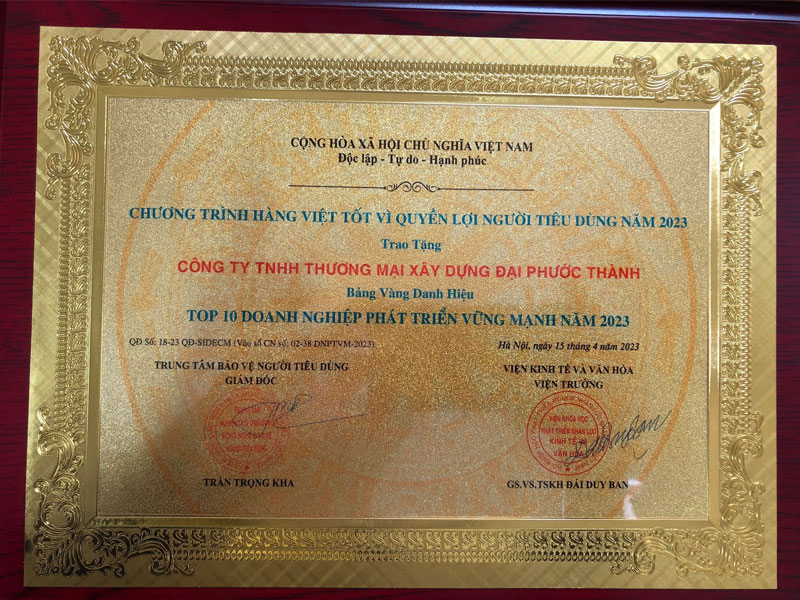 Trong suốt hơn 20 năm nỗ lực không ngừng nghỉ và khẳng định uy tín, Đại Phước Thành cũng đã gặt hái được hàng loạt giải thưởng danh giá như: Bảng vàng danh hiệu Top 10 doanh nghiệp phát triển vững mạnh năm 2023, cúp vinh danh doanh nghiệp được trao tặng bởi UBND tỉnh Tiền Giang. Bên cạnh đó, cá nhân bà Nguyễn Thị Yến Phượng - CEO Công ty TNHH TM XD Đại Phước Thành cũng được trao tặng Bảng vàng ghi danh Doanh nhân xuất sắc đất Việt 2023.